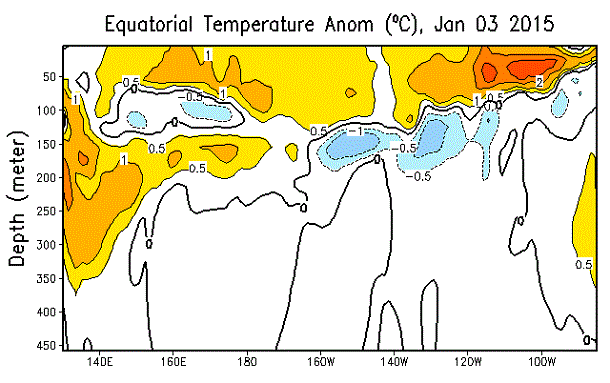 Through all these months during which the atmosphere has been saying “maybe” to El Niño, the ocean has been pretty consistently saying “yes.” However… during December, we saw a drop in the weekly Niño3.4 index, down from +1.0°C at the end of November to +0.5°C at the end of December. Plus, there is a reduction of sub-surface heat across the equatorial Pacific (fig. 2; see an animated progression here), meaning that there is a diminishing supply of heat that could recharge surface temperatures. The CFSv2 model, which has been hinting at this drop in SSTs for a couple of months now, also doesn’t think there will be a reversal in this current trend over the coming few months.