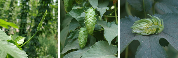 These images show the progression of Galena hops growing in the heart of hop country in Moxee, WA. From left to right, the images show the hops’ status on week 28, week 33, and, finally, on week 36, right before harvest. By this point, the natural oils have accumulated and the aroma is strong. Photo credit: Hop Growers of America.