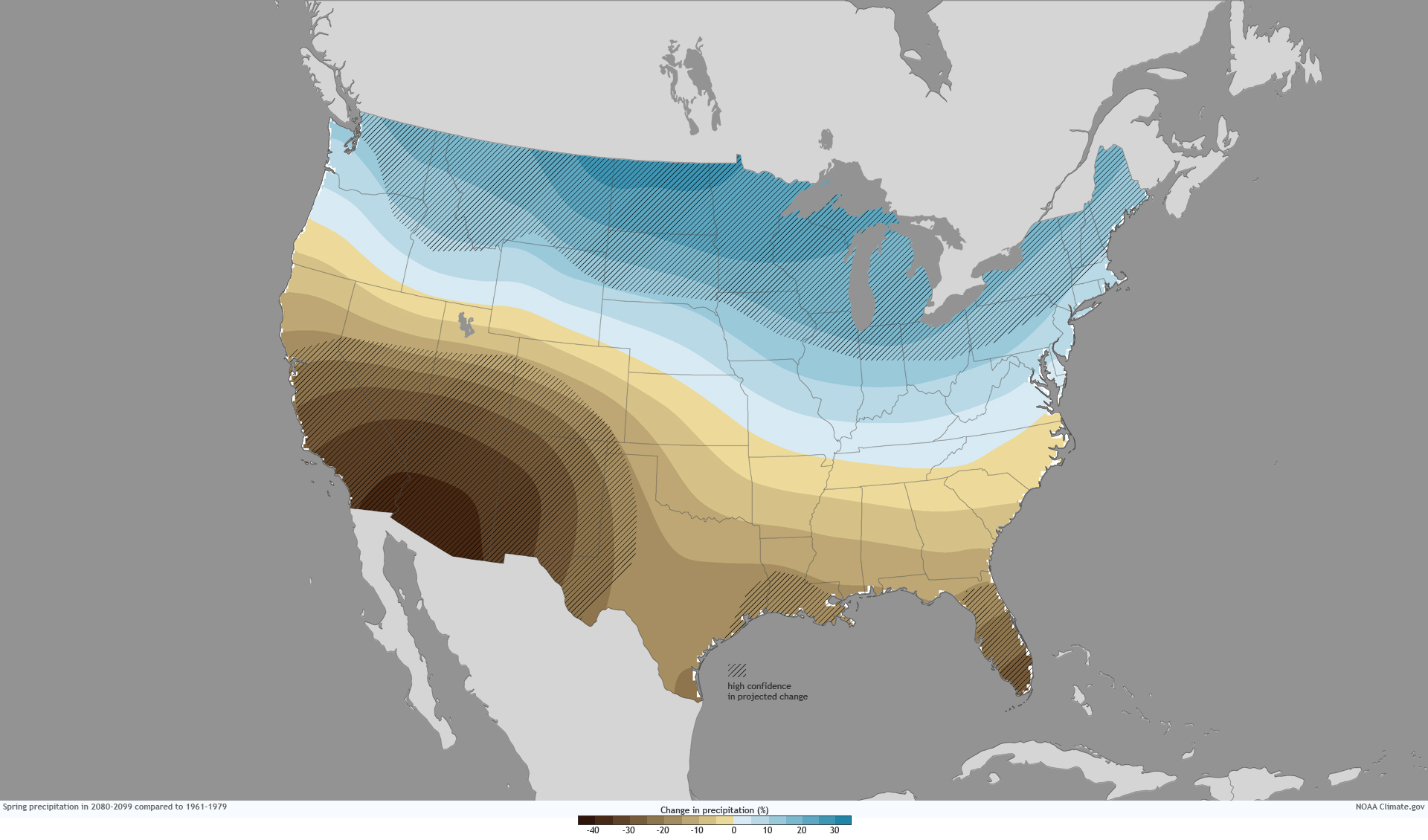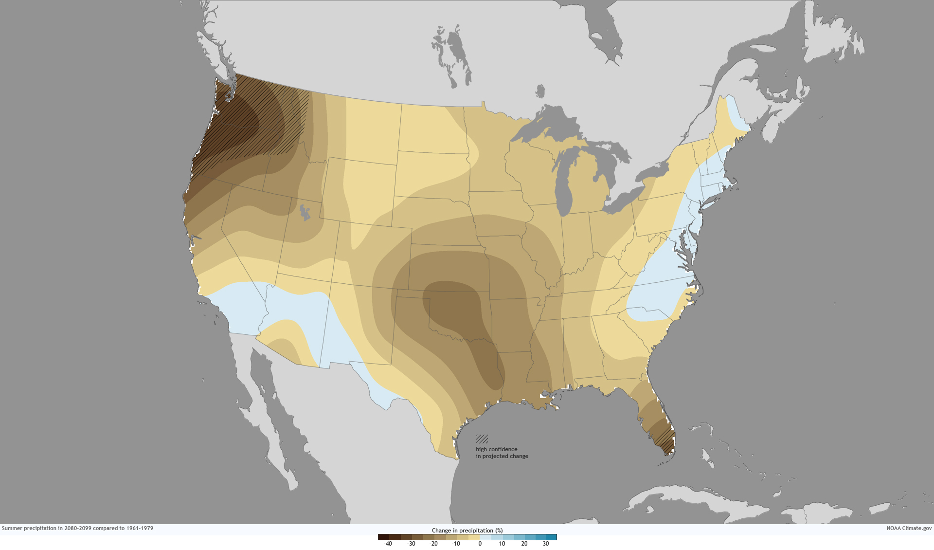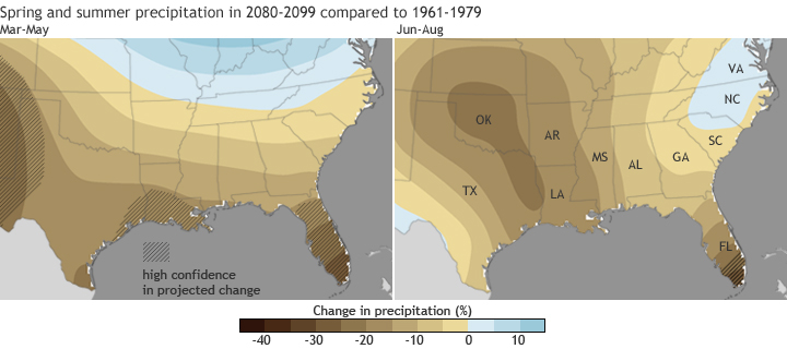 Projected changes in spring (left) and summer (right) precipitation by 2080-2099 compared to 1961-1979 for a high emissions scenario (IPCC scenario “A2“). Confidence is highest in hatched areas. Map adapted from original, in the 2009 Global Climate Change Impacts in the United States report, p. 31.