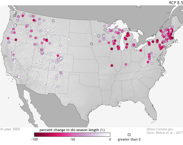 Under both scenarios, winter season length could be cut short by more than half in some locations as soon as 2050. Shorter ski seasons “could result in millions to tens of millions of foregone recreational visits annually by 2050, with an annual monetized impact of hundreds of millions of dollars.”