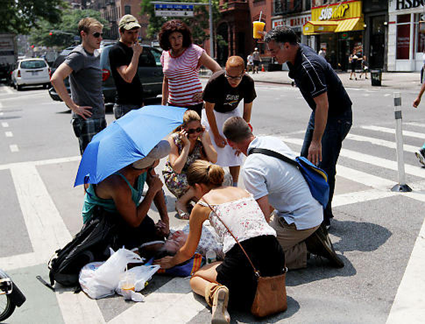 An elderly woman faints from heat on New York City's Upper East Side in 2011. Photo from New York Daily News/Marcus Santos.