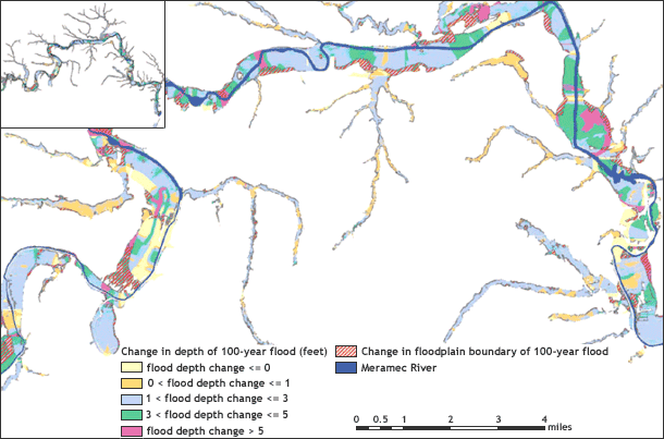 Researchers on the project developed a technique and methodology for analyzing the costs and benefits of land conservation targets for flood mitigation purposes. The technique involves geospatial analysis of parcel-level data on land uses and property values (usually available from county tax assessors), land cover data combined with the Hazus-MH flood hazard model and other hydraulic models, and economic analysis to develop targeting scenarios and compare costs to benefits. Working with a range of partners, the researchers applied their technique to analyze the benefits of the Meramec Greenway, a portion of the River Ring that is already protected. Ongoing work is expanding the analysis beyond the Meramec Greenway to other parts of the county.