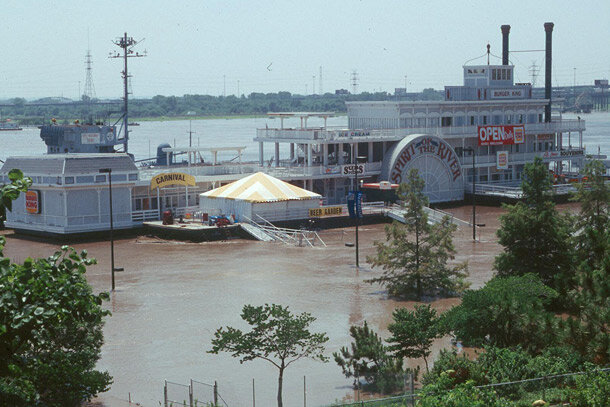 Riverboats became hard to reach after the 1993 flood in St. Louis. The main channel of the Mississippi River is on the other side of this boat. Larger image.