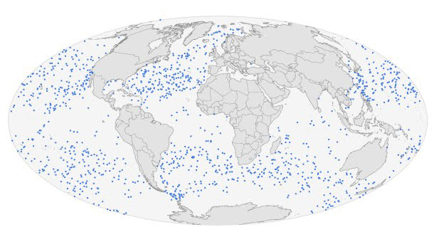 Map of locations of all drifters as of April 26, 2013. Credit: NOAA Climate.gov, based on drifter data from the Atlantic Oceanographic & Meteorological Laboratory.
