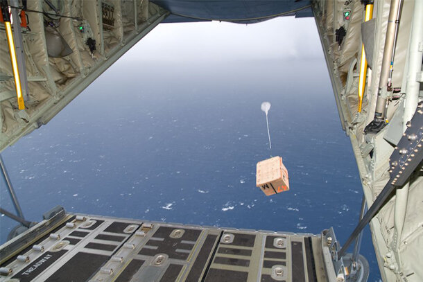 A drifter topples from the cargo bay of a plane into the path of Hurricane Dean in late summer 2007. The cardboard box dissolved, freeing the drifter. An array of drifters measured wind velocity and air and surface temperature during the passage of the Category 5 hurricane through the western Caribbean Sea. Photo courtesy Rick Lumpkin, NOAA Atlantic Oceanographic and Meteorological Laboratory.
