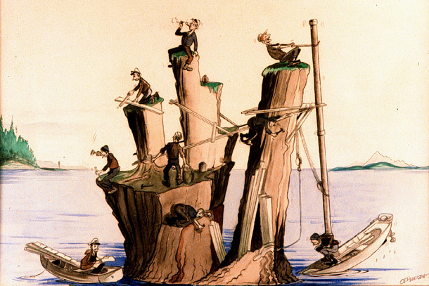 Click and drag slider to show images. Cartoon (left) of a typical tide gauge installation crew, c. 1950s, by Chief Boatswain Clarence E. Petersen, U.S. Coast and Geodetic Survey. Photo (right) of staff from the NOAA ship Rainier installing a tide gauge near Castle Cape, Alaska, on June 25, 2014. Both images from the NOAA Photo Library. large versions cartoon | photo