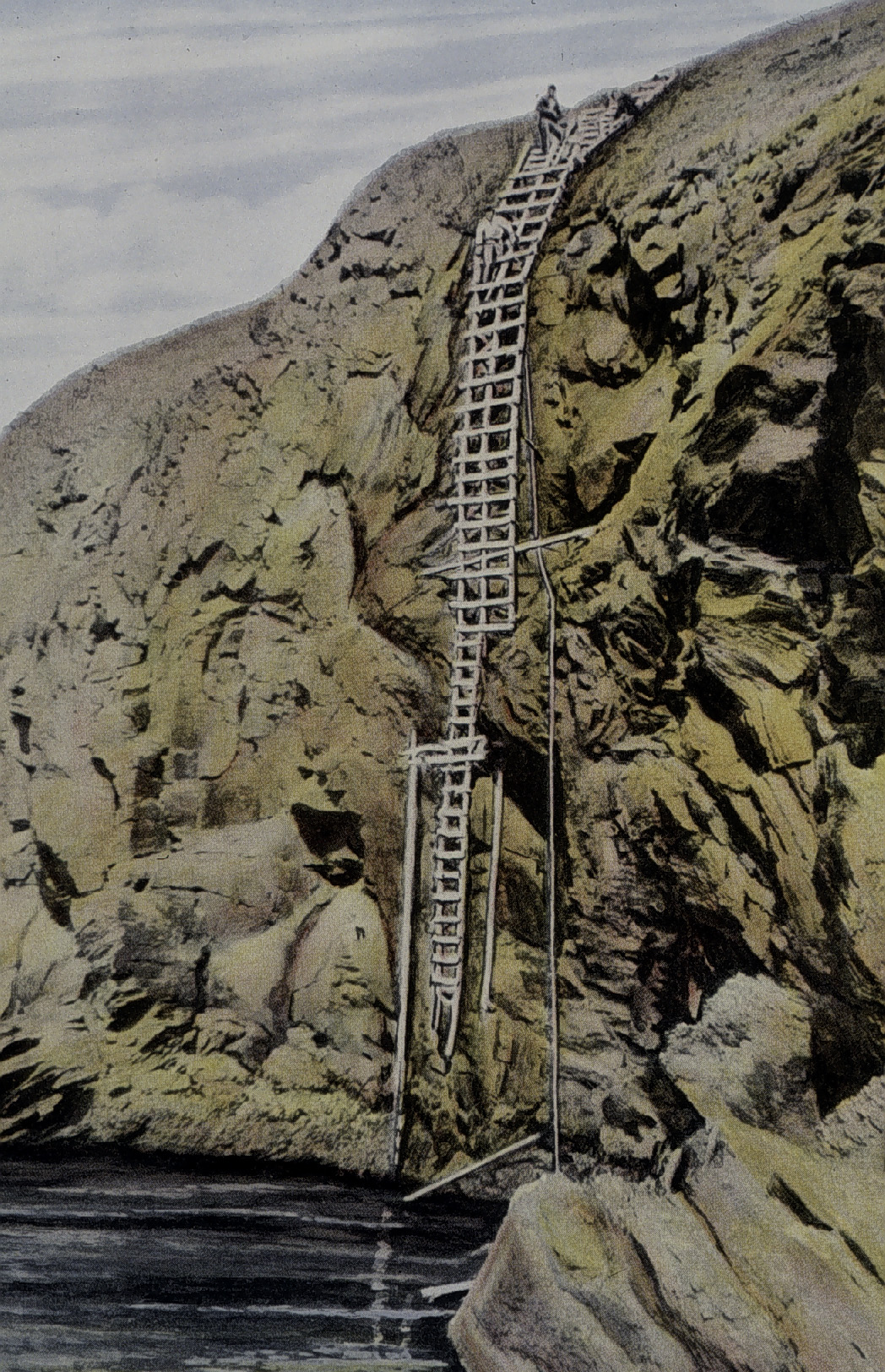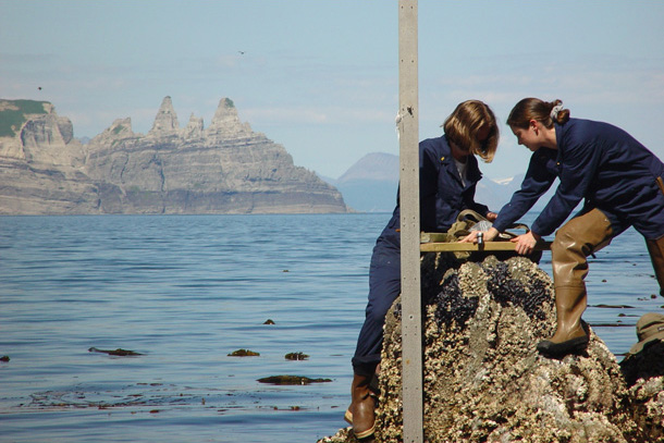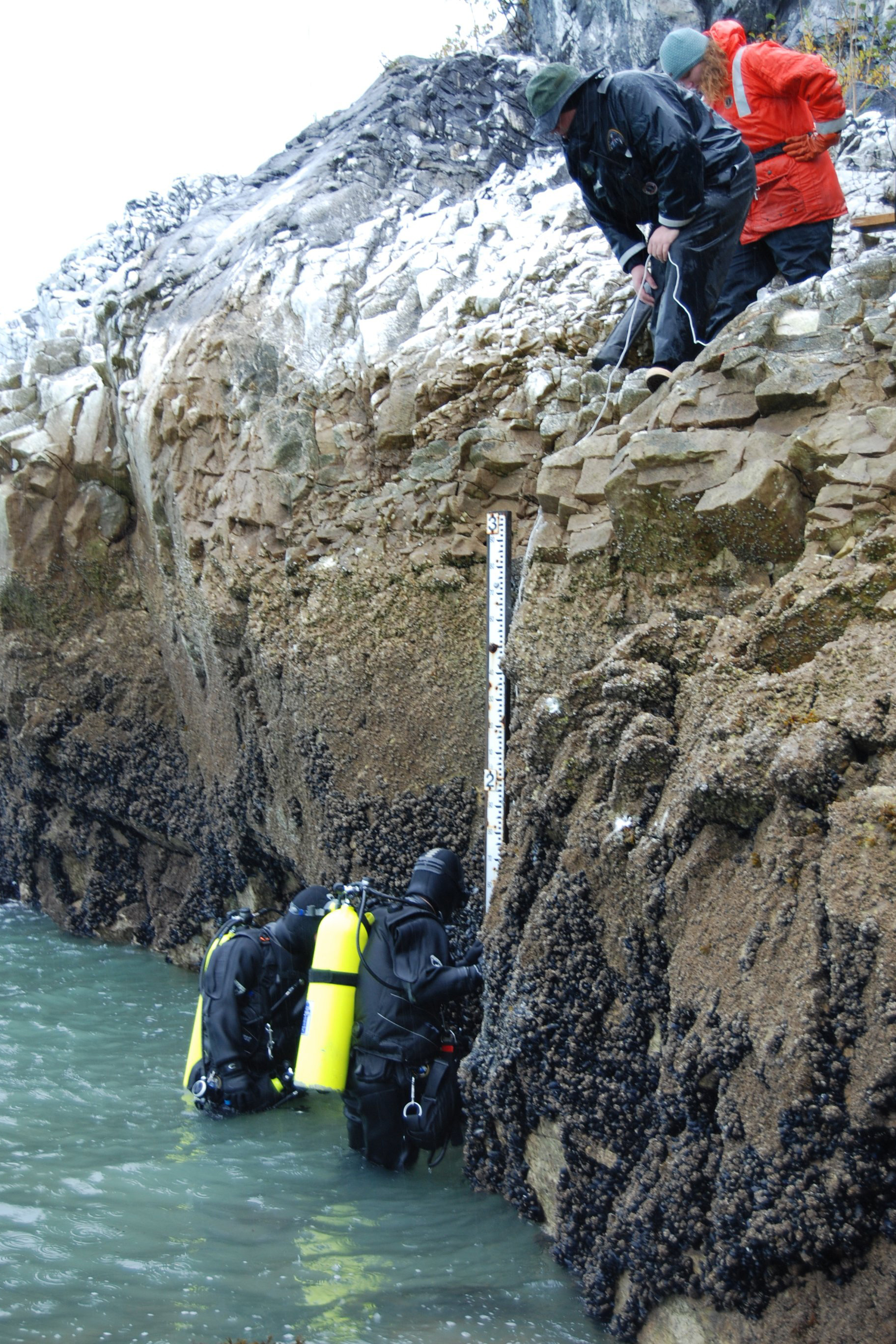 (left) To read the tide gauge at Cape Mordvinof on Unimak Island, Alaska, in 1939, scientists had to descend a 60-foot ladder suspended by wires and stakes. (large version) (right) Scuba divers check a cliffside tide staff in Glacier Bay, Alaska in 2010. (large version) Historic photo from NOAA Photo Library. Modern photo Ensign Patricia Raymond, NOAA Corps, via the NOAA Photo Library.