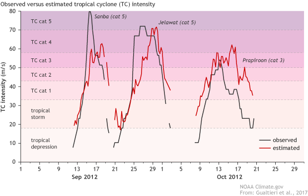 Observed (black) and estimated (red) intensities for three tropical cyclones in the northwest Pacific Ocean during September-October 2012. The slight mismatch in timing between the observed and estimated intensities likely results from the slow build-up of winds and waves strong enough to generate a seismic signals. Climate.gov graph adapted from Gualtieri et al. (2017).