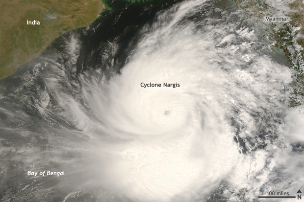 NASA TERRA/MODIS satellite image taken on May 1, 2008 of Cyclone Nargis in the Bay of Bengal. Cyclone Nargis made landfall in Myanmar on May 2 killing an estimated 138,000 people. NOAA Climate.gov image with data provided from NASA.