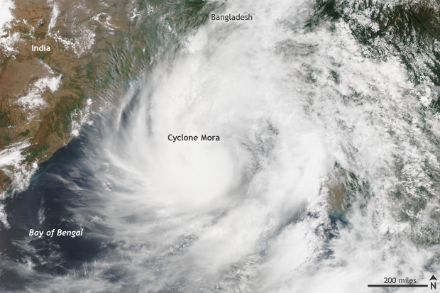 Cyclone Mora, a Category 1 storm with peak winds of 75 mph, smacked into the low-lying nation of Bangladesh on May 31. Besides the strong winds, Mora brought heavy rains and several feet of storm surge, leading to concerns for the densely packed coastal communities.