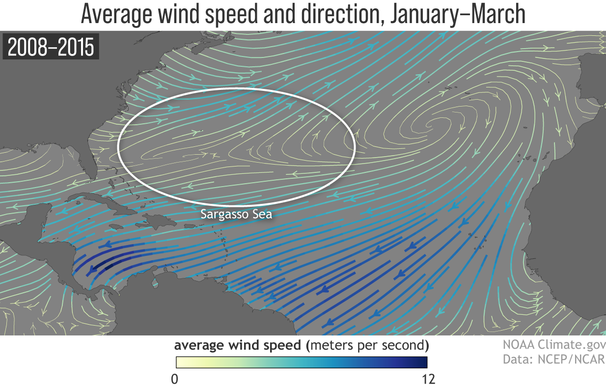The prevailing winds north of the Sargasso Sea are from the west, while winds are on average weak over the sea. On average, the westerly winds just skim the northern part of the Sargasso Sea before they veer off to the northeast around the semi-permanent Azores High. But in the winter of 2009–2010, the westerlies shifted south of their average latitude, and they flowed more due east than northeast. For most of the year, these winds blew strongly eastward across a much larger than normal portion of the seaweed-blanketed Sargasso Sea.