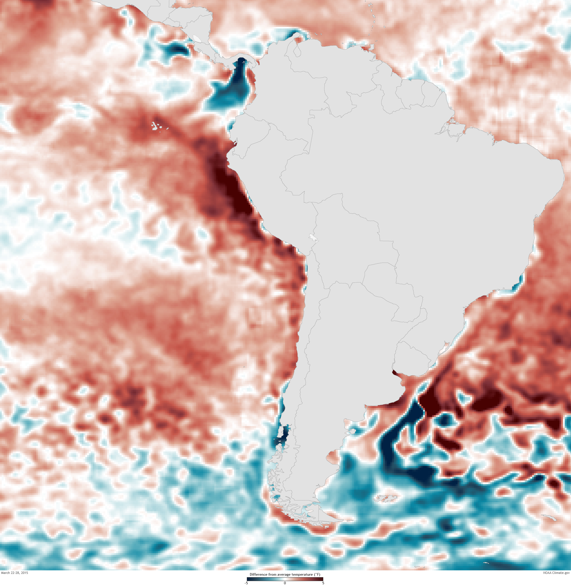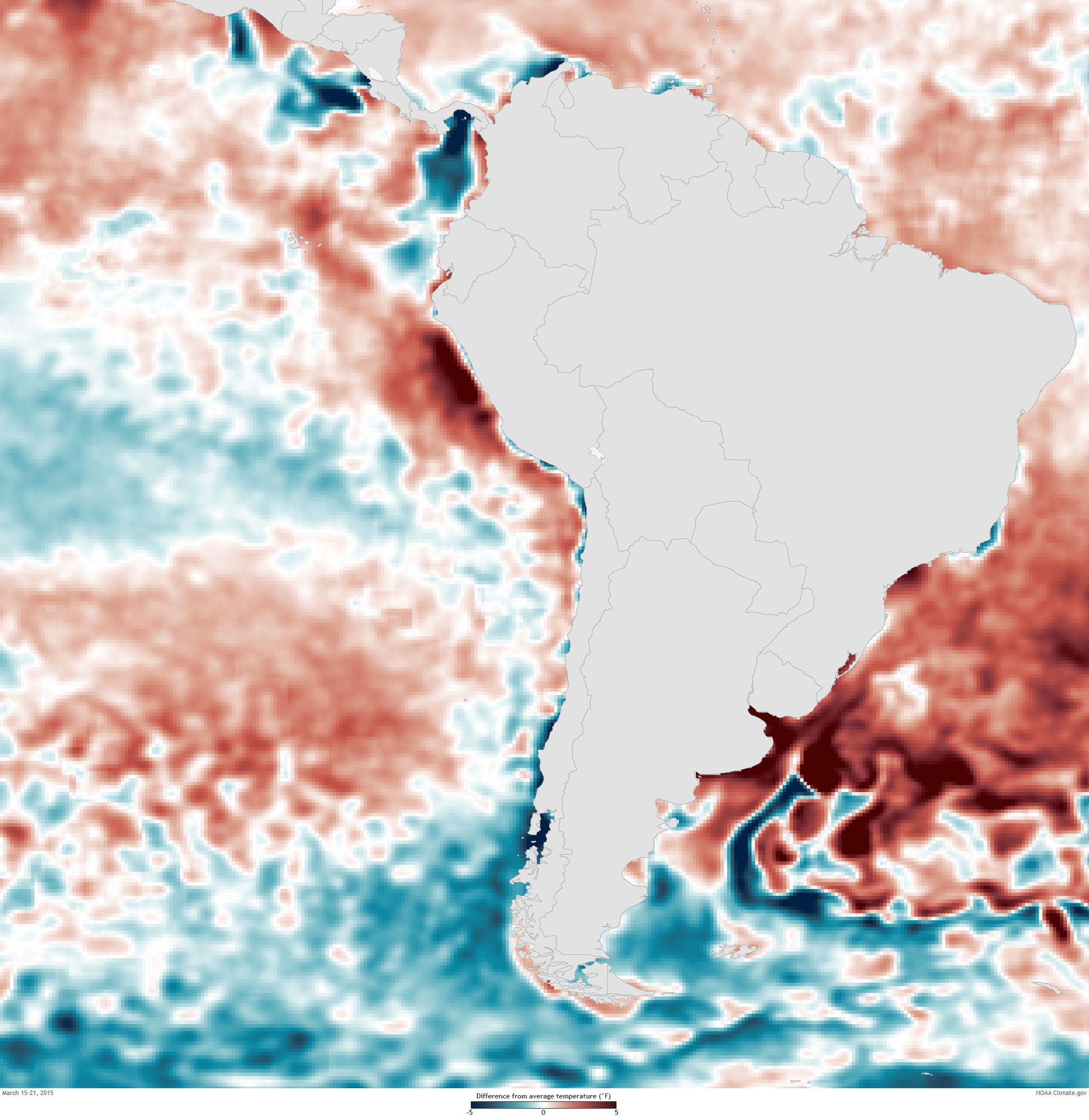 Difference from average sea surface temperature for the third and fourth week of March 2015. Increased evaporation due to rapid warming in the eastern tropical Pacific boosted the moisture available to the cut-off low pressure system over the Atacama Desert. NOAA Climate.gov image based on NOAA OISST sea surface temperature data.