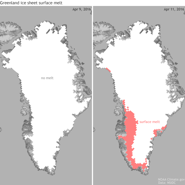 Melt patterns on the Greenland ice sheet measured for two days April 9, 2016 (left) and April 11, 2016 (right). Melt areas are determined from algorithms based on microwave satellite data which produce an estimate of melt. While no melt was present on April 9, on April 11 about 10% of Greenland's ice sheet began to melt. April 11, 2016 was amongst the earliest dates on record for at least 10% of Greenland's ice sheet to begin to melt. Map by NOAA Climate.gov and Fiona Martin based on data from the National Snow and Ice Data Center/Thomas Mote, University of Georgia.