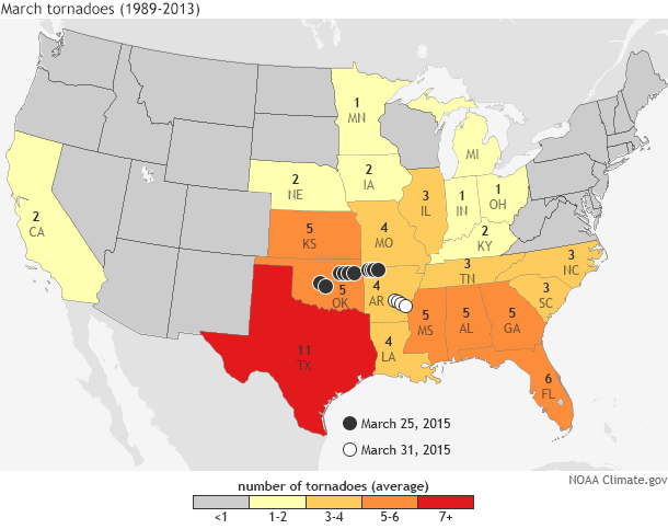 The beginning of spring conjures up certain themes: the melting of the last remnants of winter, the blooming of flowers, and the “start” of tornado season. Tornadoes can actually form during any month of the year in the United States, but they are most likely roughly between March and August with a peak between April and June. While flowers have started to bloom and there certainly has been plenty of snow to melt (and more that has fallen), tornadoes were absent for much of March 2015.