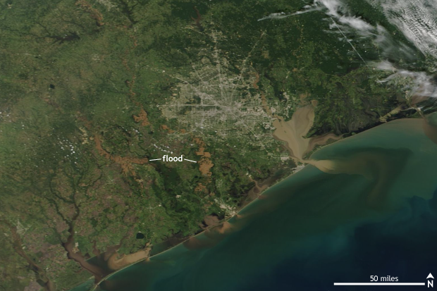 Grab and drag the slider to compare the before (left) and after (right) images of heavy rains and floods in Houston, Texas after Hurricane Harvey in August 2017. Flooding is evident along the Brazos River south of Houston. NASA MODIS satellite images from Worldview.