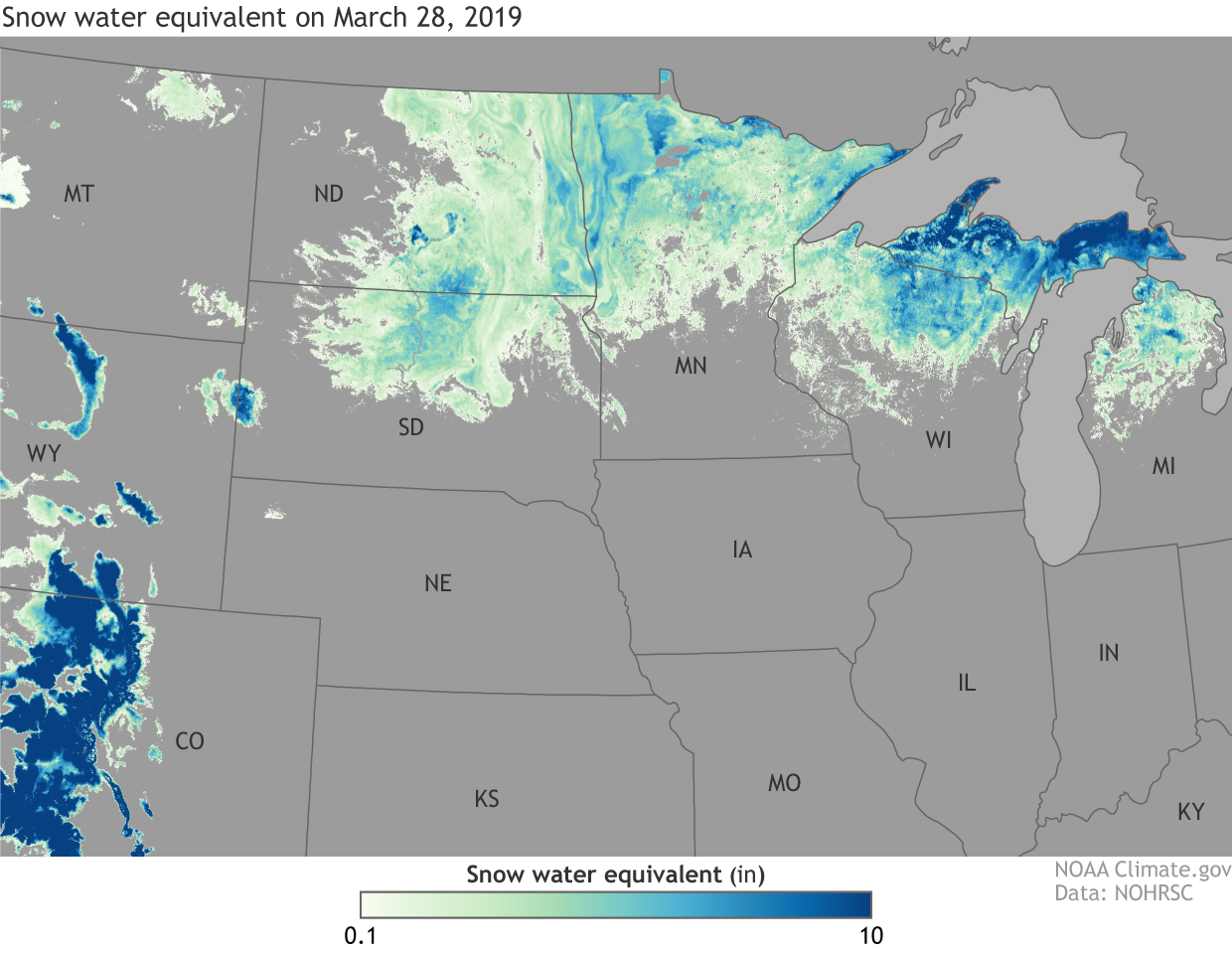 The amount of water contained in the snowpack across the Northern Plains on March 11 and 28, 2019, based on observations and models. In mid-March, a deep snowpack (dark blues) held 4-10 inches of liquid water in South Dakota, Minnesota, Iowa, and Wisconsin. By the end of March, much of it had melted and inundated the still-frozen ground, delivering a massive pulse of floodwater into area rivers. NOAA Climate.gov image using data from NOHRSC. large images: Mar 11 | Mar 28