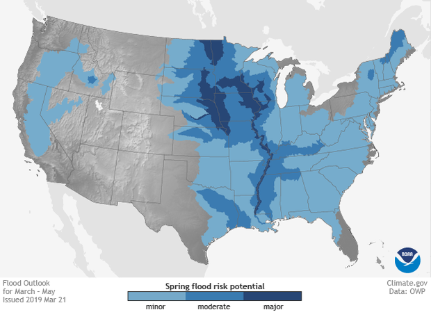 U.S. areas at risk of minor (light blue), moderate (blue), and major (dark blue) flooding from March through May 2019. NOAA Climate.gov map, based on data from the NWS Office of Water Prediction.