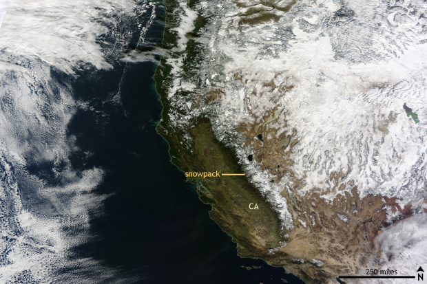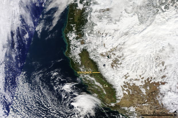 Satellite image taken on January 8, 2017. Heavy rains and higher elevation snow battered California during a multi-day atmospheric river event. NASA MODIS/TERRA satellite image taken from NASA Worldview.