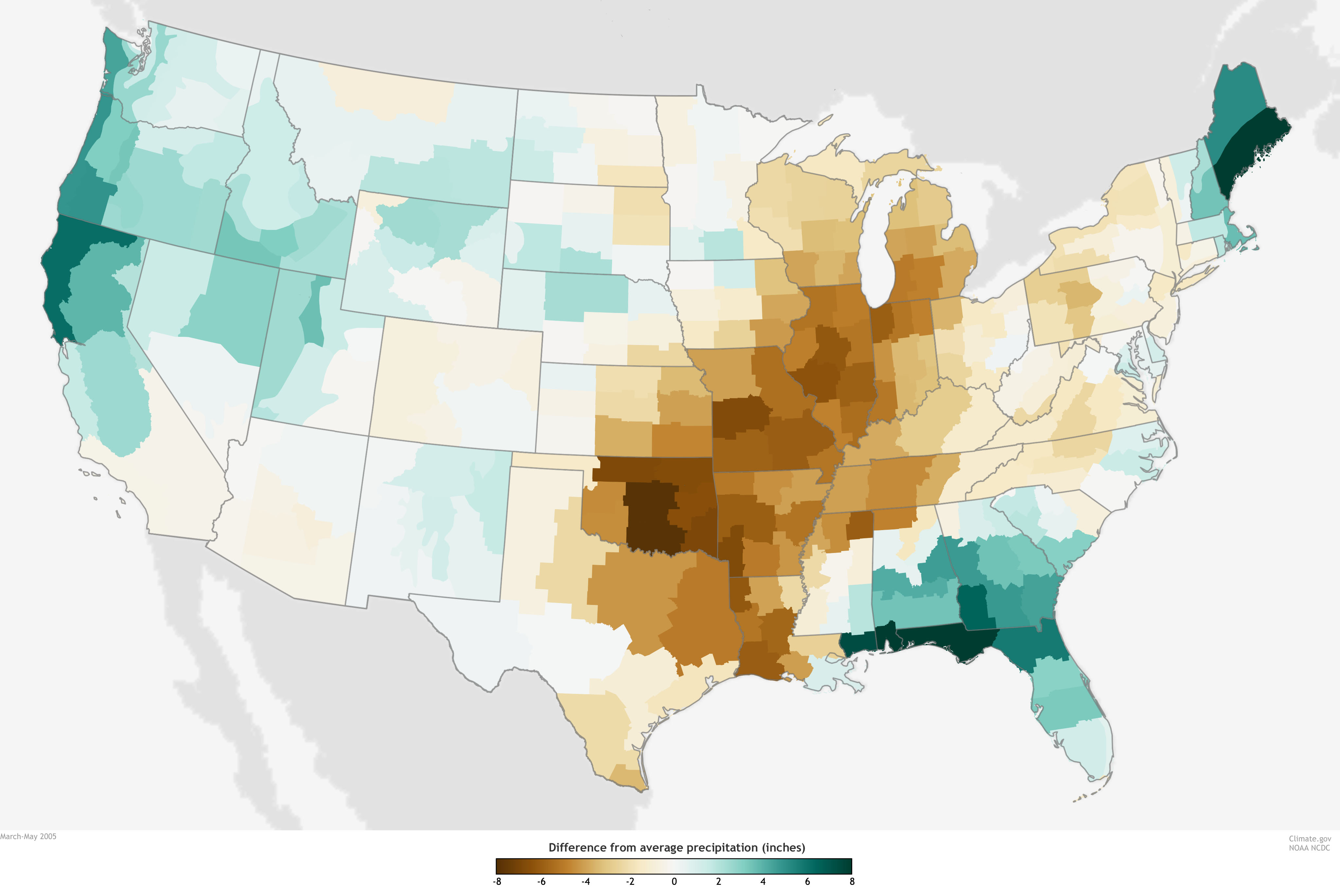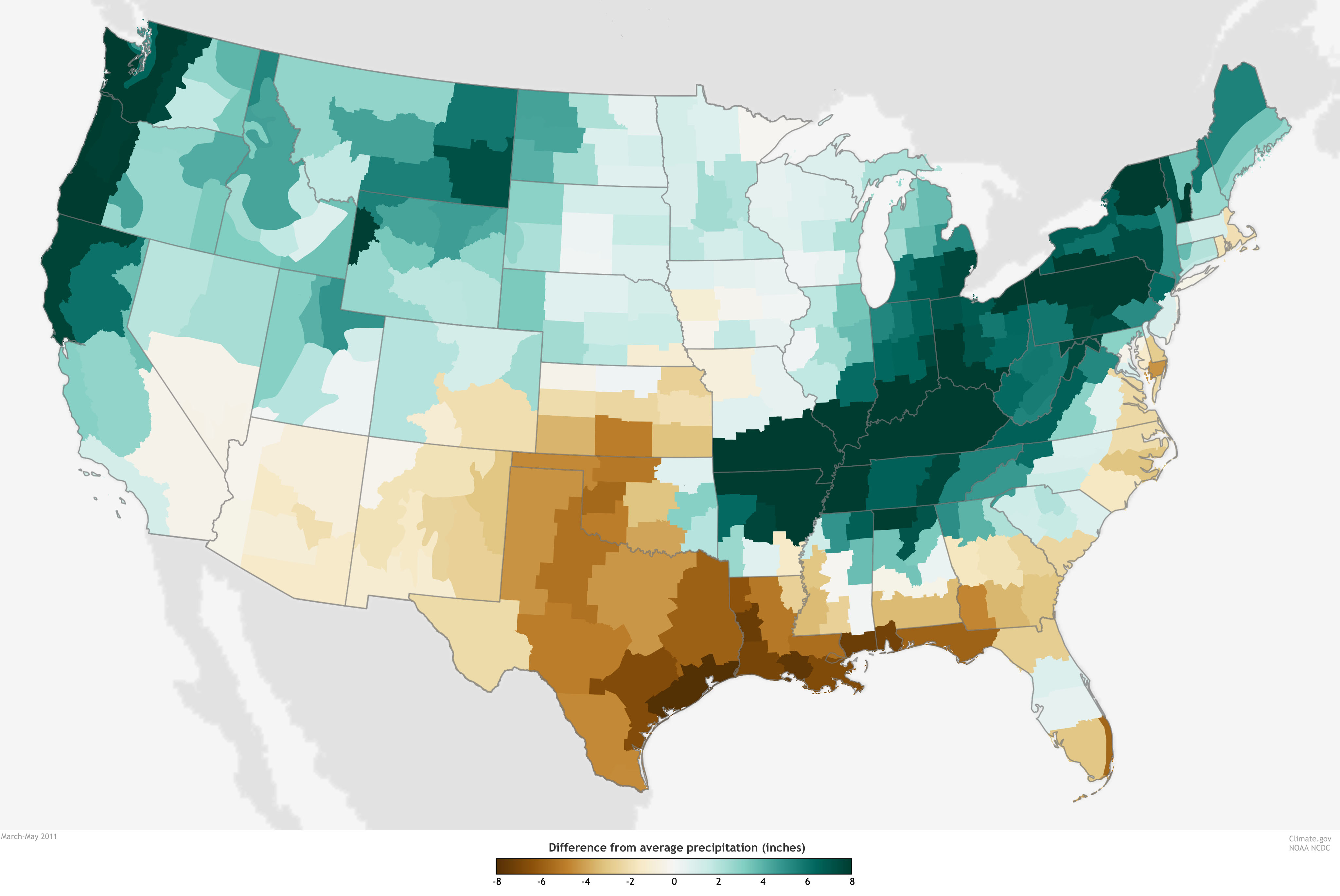 Difference from average (1981-2010) precipitation for March-May 2014, based on U.S. Climate Division Data. Map by NOAA Climate.gov.