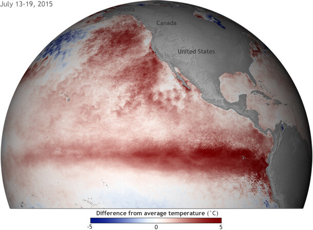 Difference from average (1981-2010) sea surface temperature across the Pacific Ocean from July 13-19, 2015. Darker red shading corresponds with warmer than average sea surface temperatures. Blue shading refers to colder than average conditions. NOAA map based on satellite data.
