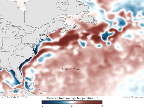 This set-up in the atmosphere has allowed air to be cold enough for snow across the Northeast, plus it has set-up a perfect path for storms to drop down out of Canada and head for New England (note the arrows on the figure): every storm slides down the high-to-low-pressure seesaw. And to make matters more favorable, warmer-than-average sea surface temperatures off of New England likely helped to increase the temperature contrast near the coast, which may have enhanced the storms.