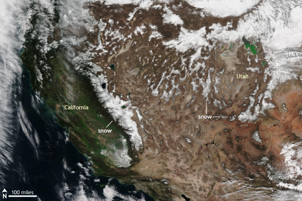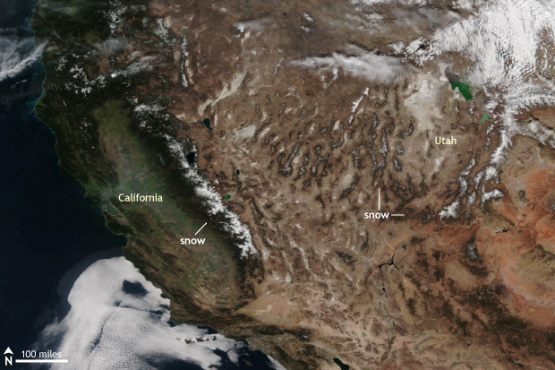 Grab and drag the slider to compare the before (left) and after (right) satellite images of the snowpack across the western United States. So far in 2018, snow levels have been below average and much lower than 2017. Suomi VIIRS satellite images from the NOAA Environmental Visualization Laboratory.