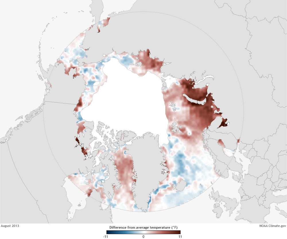 With less and less of the Arctic covered by sea ice at the height of summer, ocean temperatures around the margins of the ice pack tend to be much warmer than average today than they were historically. However, in any given summer, natural variability in the prevailing winds and currents can amplify the overall warming in some places, and lessen it in others. Most of the Arctic boundary waters were warmer than average in summer 2013, but a few cool pockets appeared in the western Arctic and the Greenland Sea.