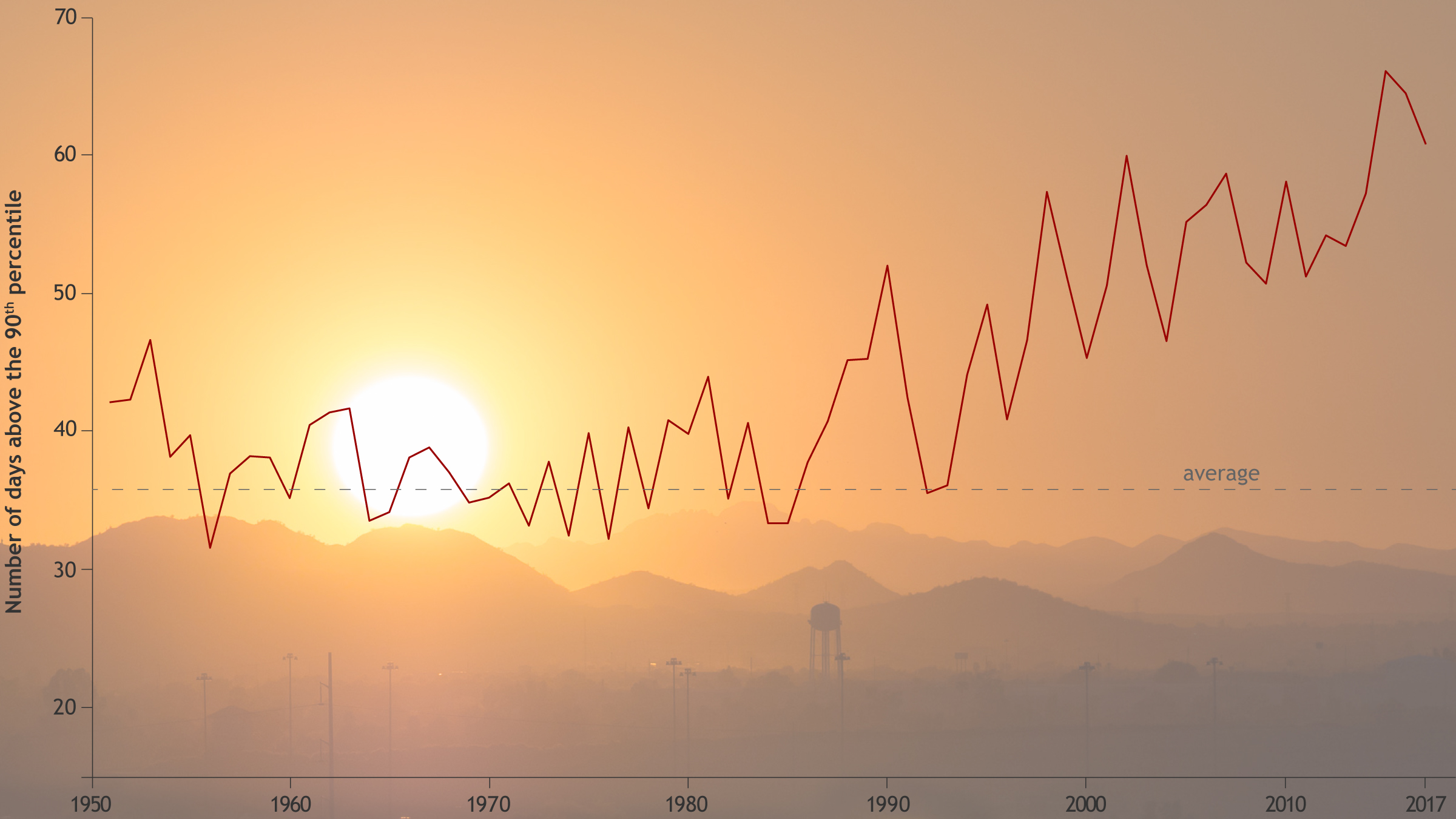 The graph shows the number of hot days each year since 1950 relative to the 1961–1990 average. Extreme heat relaxed a bit in 2017 compared to 2016 and 2015, the latter of which holds the record for highest number of hot days. Still, 2017 recorded more than 60 days of extreme daytime heat worldwide, nearly double the 1961–1990 average of 36.5, continuing the long-term trend toward more hot days each year across the globe.
