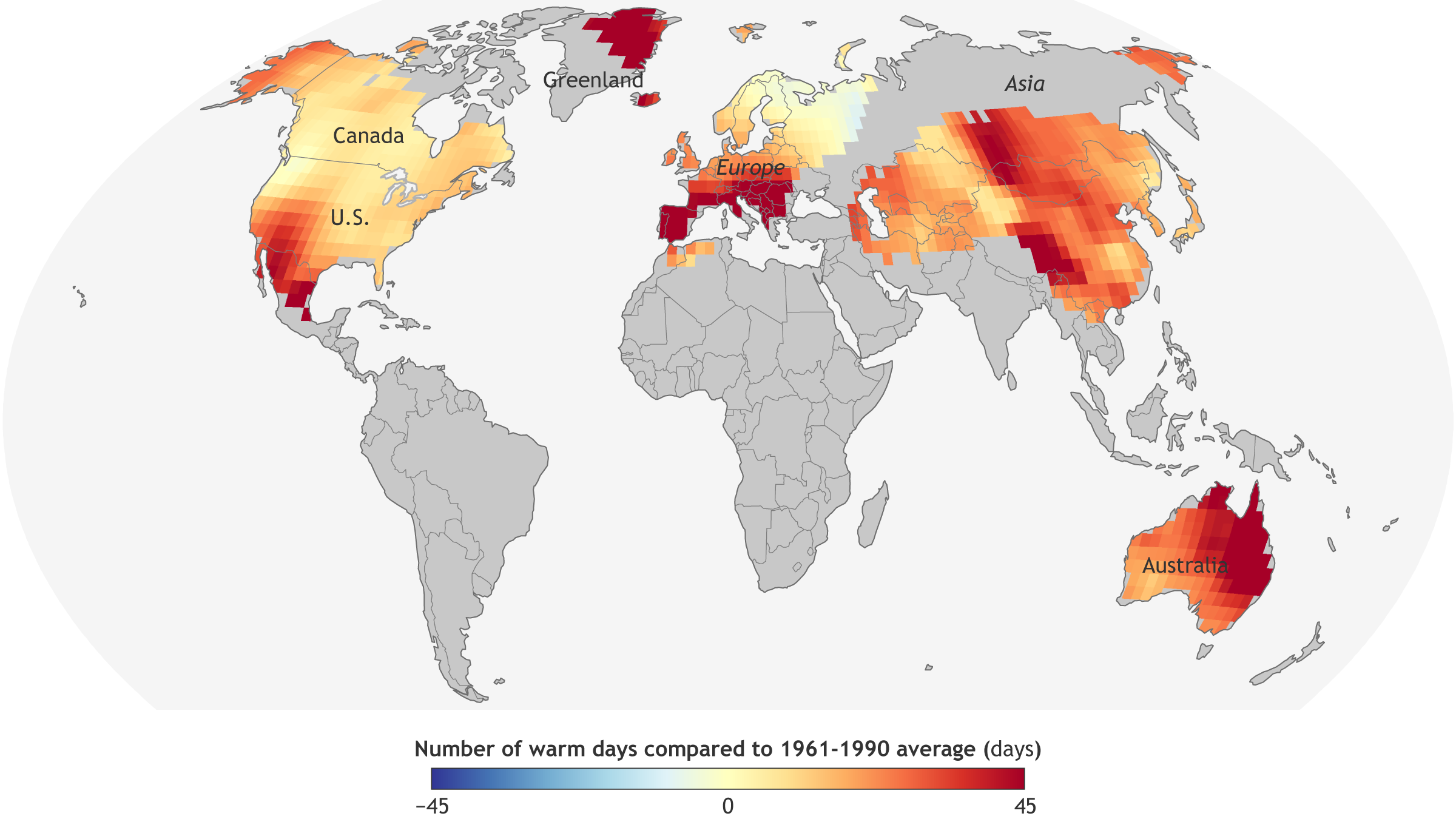 Adapted from the State of the Climate in 2017, this map shows the number of extremely warm days experienced in 2017 compared to the 1961–1990 average. For this analysis, “extremely warm” means in the top 10 percent (above the 90th percentile) of daytime high temperatures at that location from 1961–1990. In an average year, 36.5 days (10 percent of 365) would meet this threshold. Places that exceeded that threshold in 2017 are colored in shades of yellow, orange, and red; places with fewer days than the climatological average appear in shades of blue.
