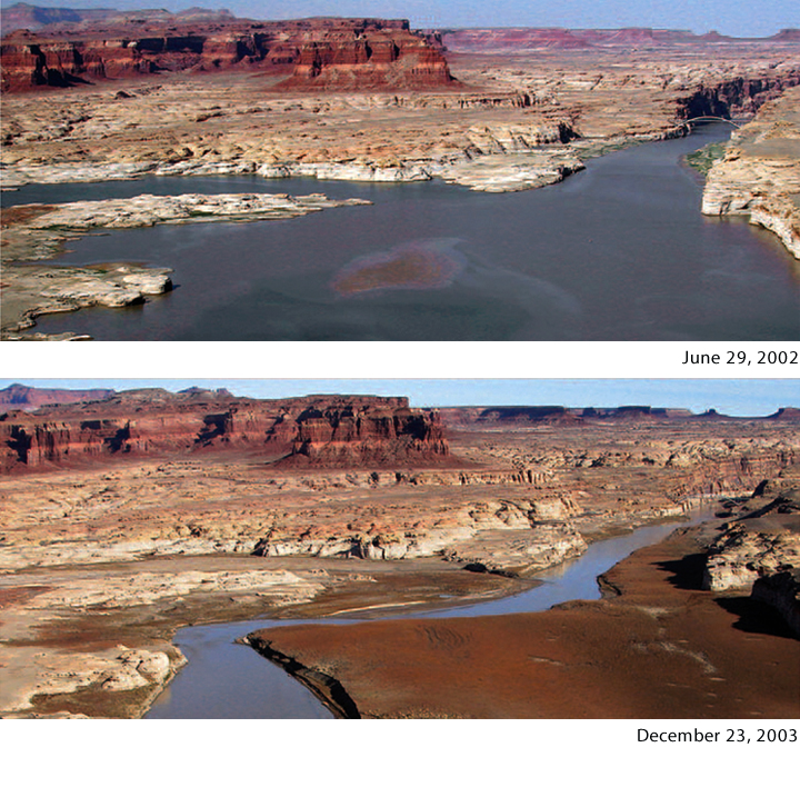 The two photographs, taken 18 months apart, show a significant decrease in the water level of Lake Powell. Extending across the border between Utah and Arizona, Lake Powell is the largest reservoir in the Colorado River system. The white “bathtub ring” seen on the rocky sides of the canyon shows the historical high water level in the reservoir. The ring is a coating of minerals, deposited on the rocks while they were covered by water.