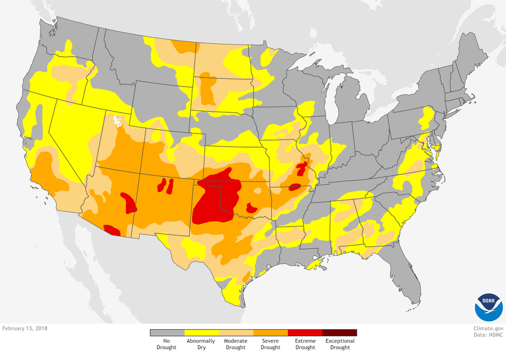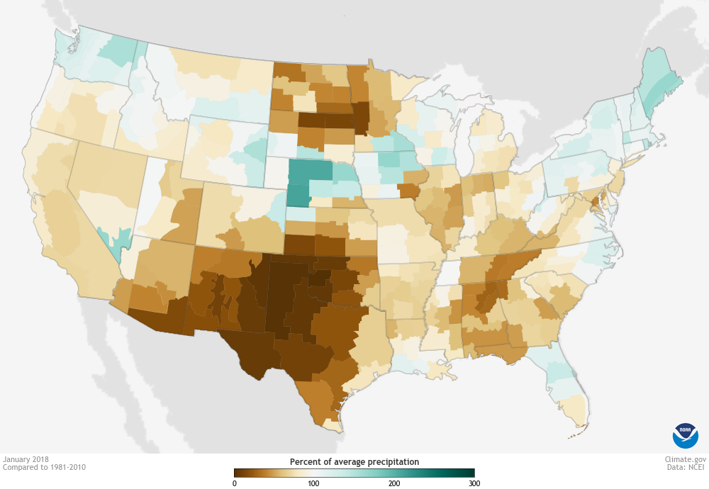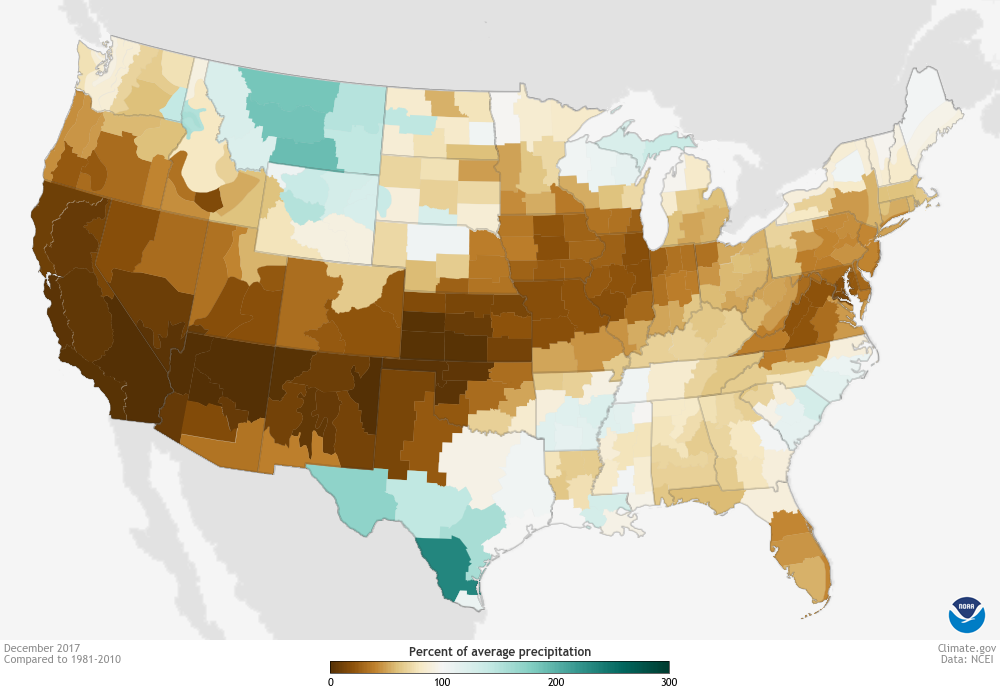 While a lack of precipitation is not the sole reason droughts exist or worsen, it does tend to coincide with drought. And during December 2017 and January 2018, large swaths of the country observed below-average amounts of precipitation.