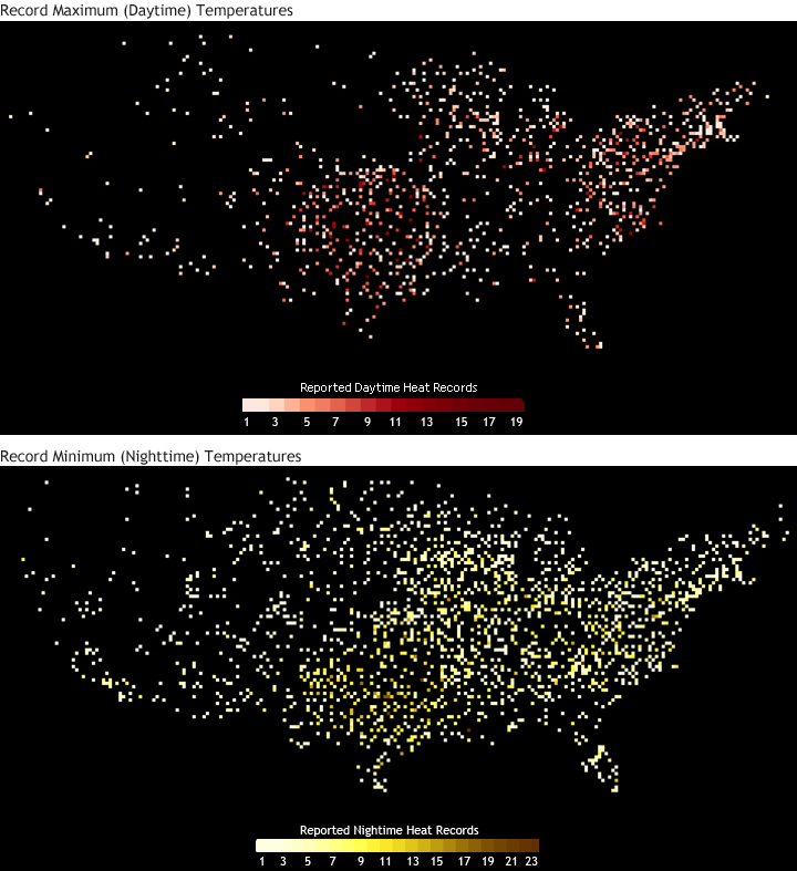 Almost 9,000 daily records were broken or tied last month, including 2,755 highest maximum temperatures occurring during the daytime, and 6,171 highest minimum temperatures during nights and early mornings. Unusually warm minimum temperatures have been typical of U.S. heat waves in the last decade, and consistent with increasing warm summer nighttime extremes observed across much of the country since the late 20th century. (For more information about changing U.S. temperatures, see The New Climate Normals: Gardeners Expect Warmer Nights).