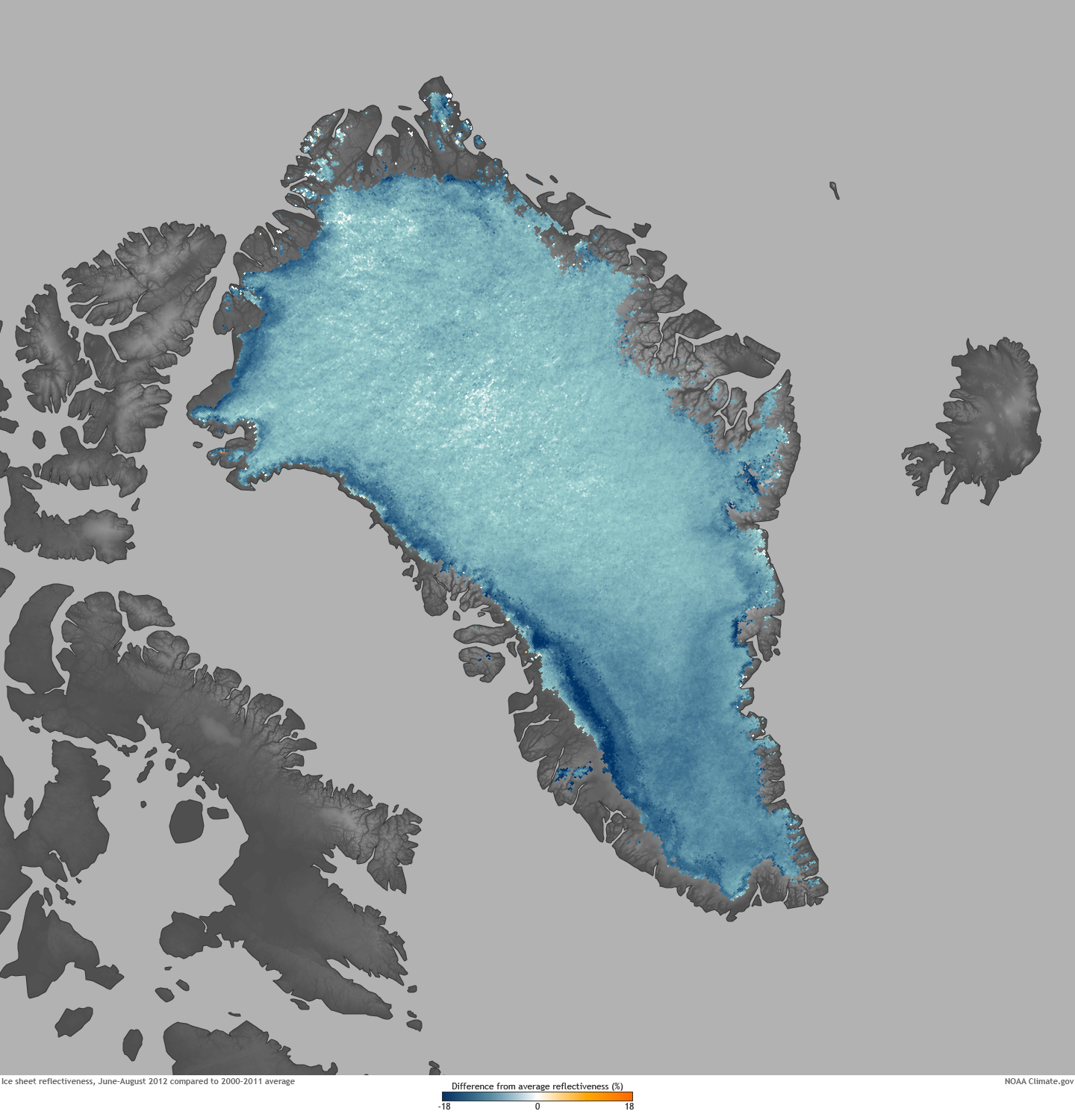 The map at right shows the percent of incoming sunlight Greenland reflected during June through August 2012 compared to the average of summers from 2000-2011. Blue indicates less sunlight reflected than average, with dark blue indicating nearly 20 percent less sunlight than average reflected back into space. The darkest areas occurred around the perimeter of the island—the lowest elevations, where melting is most significant—but virtually the entire ice sheet showed below-average reflectivity.