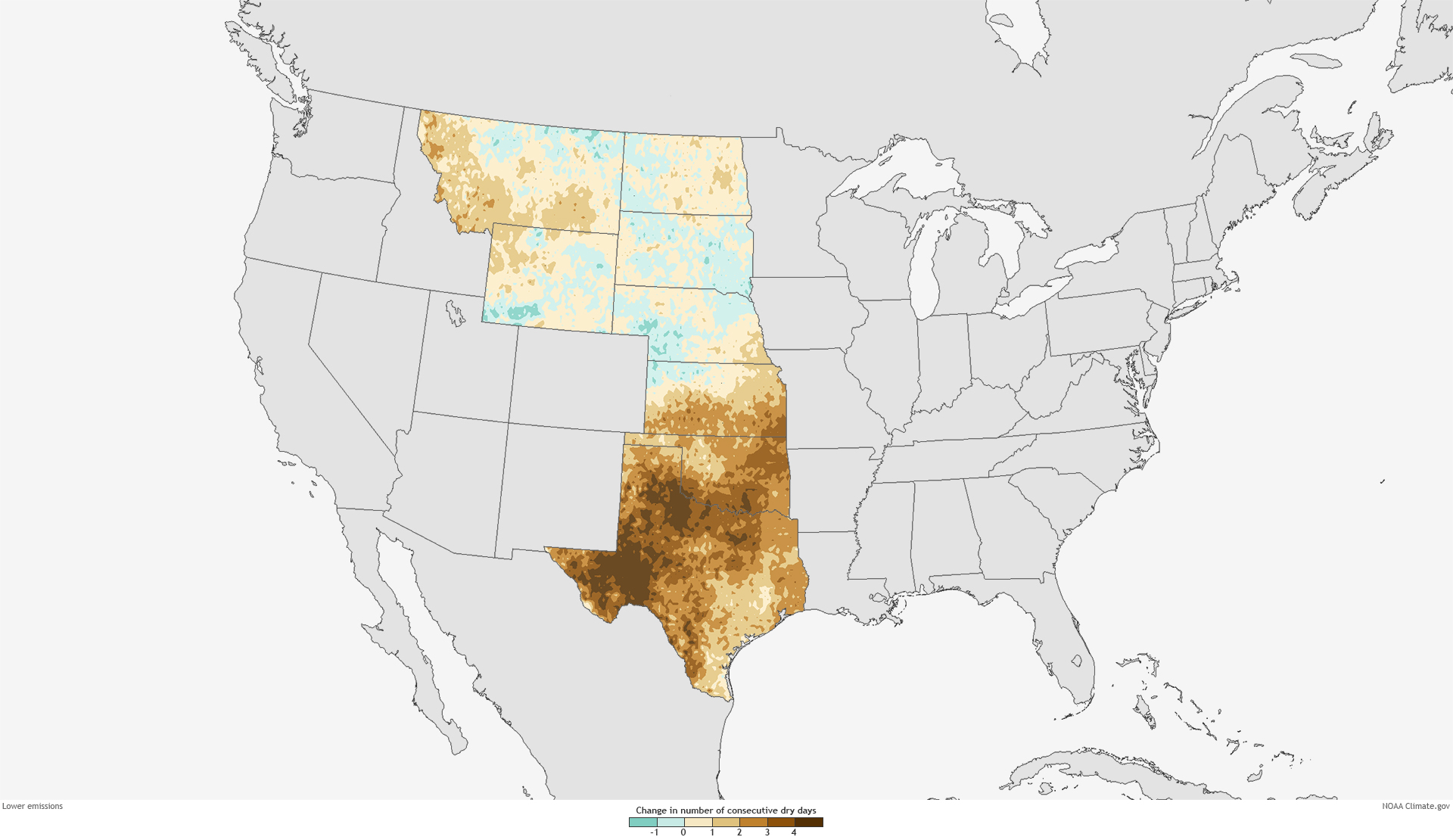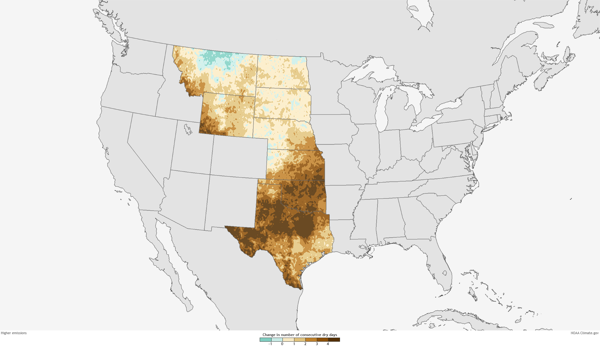 In both emissions scenarios, consecutive dry days are likely to increase throughout most of the southern Great Plains, particularly from Kansas southward. Projections are more severe under the continued-emissions scenario, which also shows lengthened dry spells in southwestern Montana, southwestern Wyoming, and southeastern Nebraska.