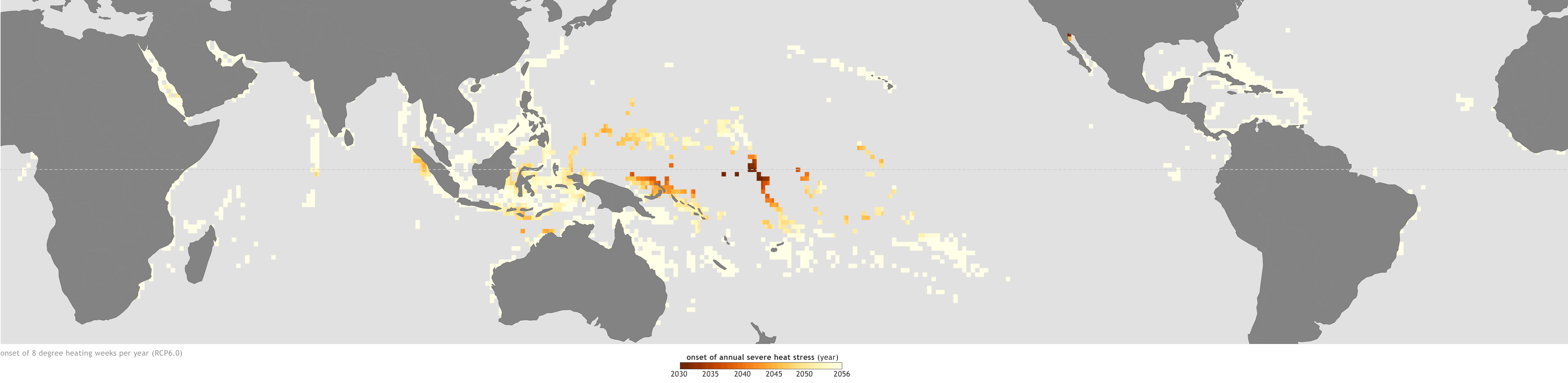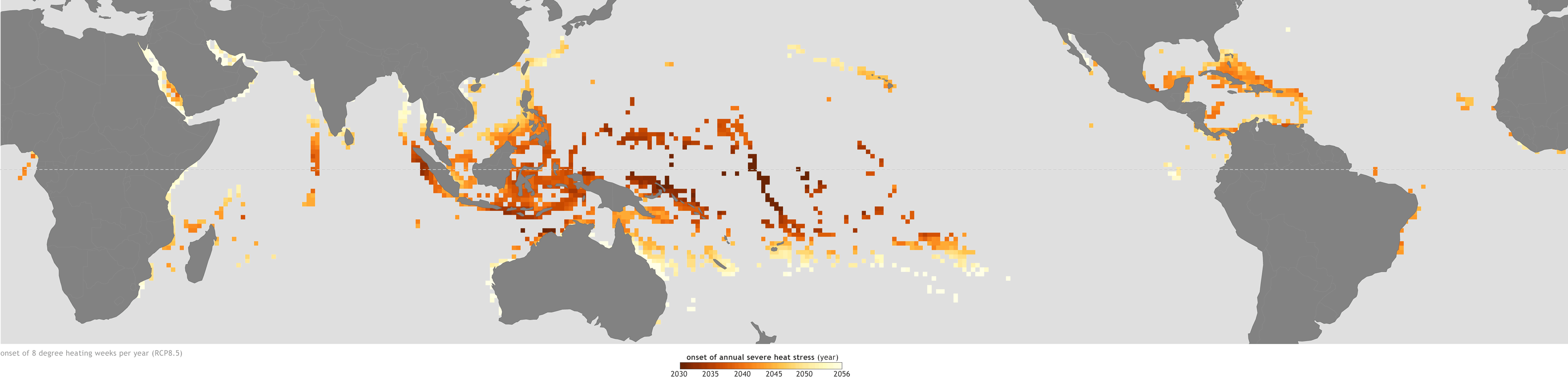 Corals close to the equator—such as around the Solomons Islands—are projected to experience potentially fatal levels of heat stress on a yearly basis in less than 15 years with continued high rates of carbon dioxide emissions. Meanwhile, reefs at higher latitudes, such as those around Fiji or Hawaii, may have three decades before they hit that threshold. This latitude-linked pattern is consistent for reefs around the globe. (See global views of heat stress and aragonite saturation state maps.)