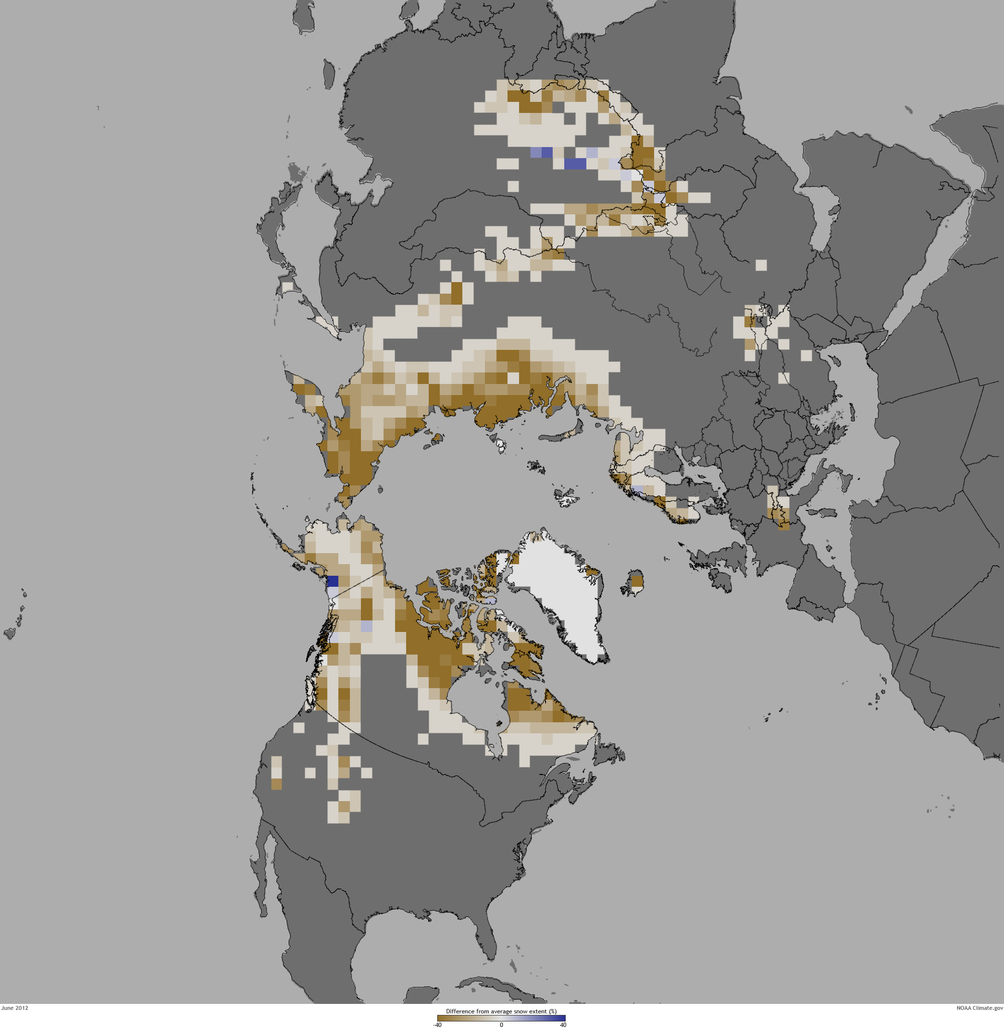 The map above shows snow cover anomalies in June 2012 in the Northern Hemisphere compared to the long term average (1971-2000) based on the number of days in the year where a location was snow covered. Shades of brown indicate places that experienced up to 40 percent fewer snow-covered days than average in June 2012, while blue shows areas that experienced up to 40 percent more snow-covered days than average.