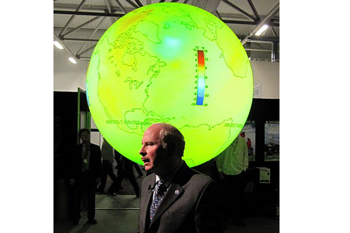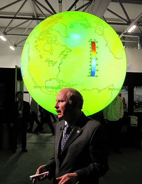 Dr. MacDonald, Director of NOAA’s Earth System Research Laboratory, presented a live “SphereCast” from the United Nation’s Climate Change Conference (COP15) in Copenhagen, Denmark, speaking to local audience of about 30 and many hundreds more who watched the presentation from 11 museums and other institutions around the world. Science on a Sphere —a room sized, global display system that uses computers and video projectors to display planetary data onto a six foot diameter sphere — was the centerpiece of the U.S. Center at the conference.