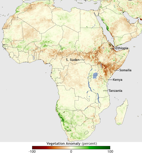 In the region known as the Horn of Africa—the peninsula in eastern Africa south of the Red Sea—a combination of climate variability and social problems make millions of people vulnerable to food shortages. Much of the region has a semi-arid climate, and yet more than 115 million people earn their living through agriculture. When the rains are poor, drought can lead to famine.
