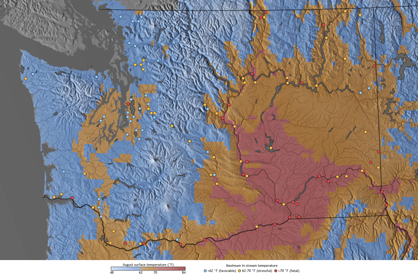 NOAA-funded modeling research led by Nathan Mantua projects that the number and duration of thermal roadblocks and potential death zones in Washington's salmon rivers and streams will increase significantly within the next 70 years as greenhouse gas emissions continue to rise.* The maps below show average air temperatures for August (underlying maps) and maximum water temperatures (colored dots) for historic (1970-1999) and future time periods (2020, 2040, and 2080). Colors indicate habitat quality: favorable (blue), stressful (orange), and fatal (pinkish-red).