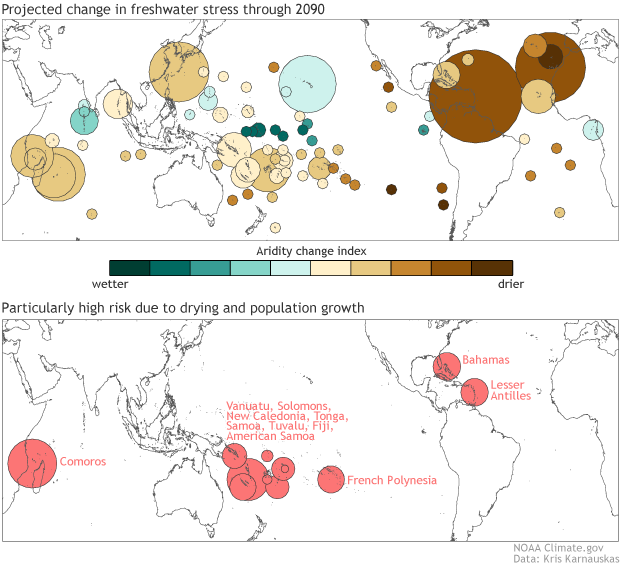 The bottom map shows small island groups that may be especially vulnerable by the end of the century due to a combination of drying and expected population growth. (Only the 22 island groups that had their own entry in the World Bank’s nation-specific population database were included in the second analysis.) The size of the dots on this map was determined by multiplying the projected change in freshwater stress in 2090 by the estimated population growth by 2050 (the farthest time horizon available for these islands).