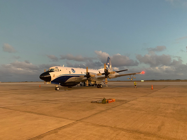 P3 Hurricane Hunter aircraft on the tarmac in Barbados during the ATOMIC field campaign in January 2020. Photo: Gijs de Boer