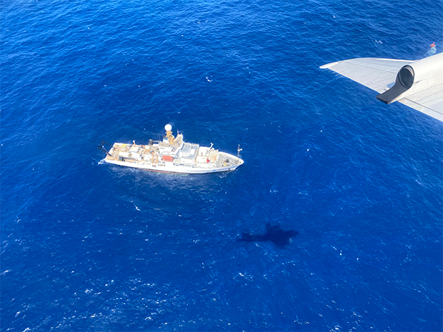 Photo of the NOAA Ship Ronald Brown taken from the P3 Hurricane Hunter aircraft during the ATOMIC field campaign in January 2020. Photo: NOAA