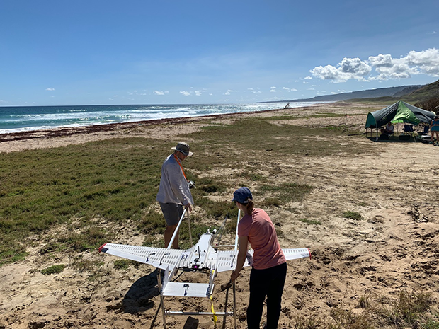 Dr. Gijs de Boer and Dr. Radiance Calmer prepare the RAAVEN aircraft to be launched off the beach in Barbados during the ATMOMIC field campaign in January 2020. Photo: Gijs de Boer