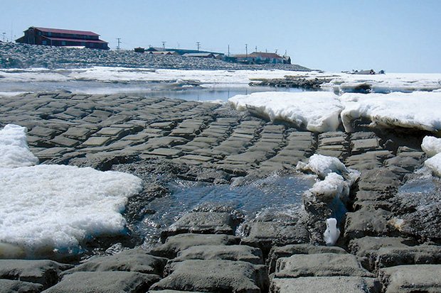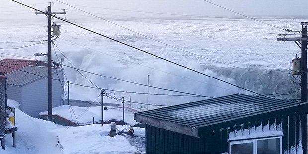 Shishmaref : Freeze-up was unusually late in Shishmaref. Even when the surrounding area appeared to have ice, there was a stretch of open water around the community into mid-January. After the ice finally formed, it repeatedly broke up during storms, allowing surf to push large ice chunks onto beaches. [Climate change has forced some Arctic communities to relocate.]