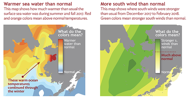 In addition to higher ocean temperatures, there were frequent storms. From December to February strong south winds were recorded at both the sea surface and mid-level in the atmosphere. In the Bering Sea, south winds are an indicator of storminess. Although the number of storms this winter did not hit a record, they occurred more often than normal.
