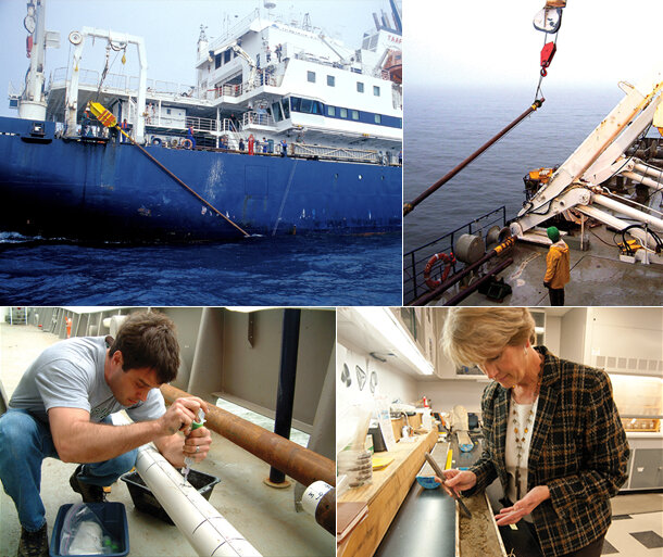 “It was the only ship that had the capability to get long continuous cores,” says Willard. A research geologist with expertise in buried pollen, she coordinated the expedition for the cadre of American scientists, most of them from the U.S. Geological Survey and the Naval Research Laboratory. The R/V Marion Dufresne came equipped with science laboratories, high-end computer workstations, and huge cranes, but its secret weapon was the Calypso corer, one of the longest, heaviest coring samplers in the world.