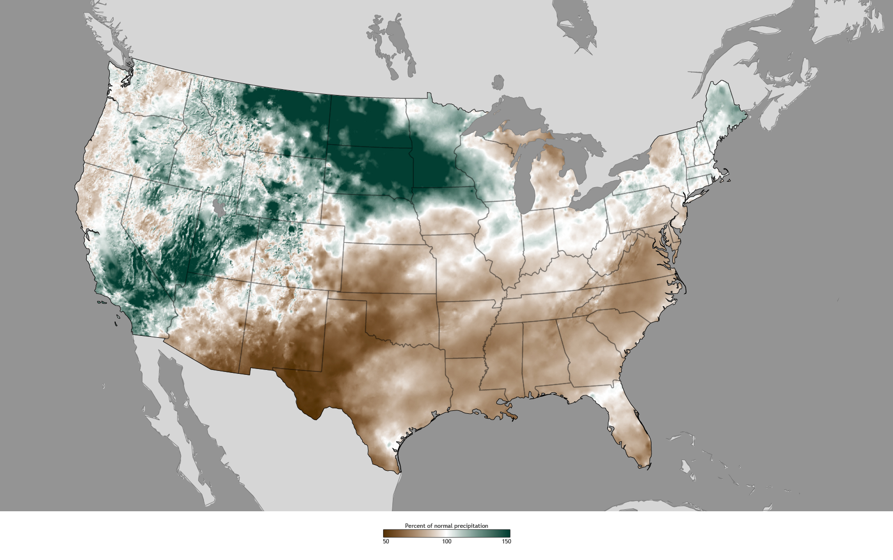 Summer rainfall in the U.S. Southeast was below normal in 2011. This map shows percent of normal precipitation for June, July, and August 2011. Green areas received up to 150 percent of their normal rainfall, white areas received 100 percent of normal, and brown areas received less than 100 percent of normal. NOAA maps by climate.gov team, based on precipitation data provided by the PRISM Climate Group at Oregon State University.