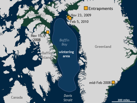 The map shows the locations of four recent entrapment events that took place from 2008-2010, and the approximate areas where narwhals gather during the winter and summer seasons in Baffin Bay. The narwhals were found trapped in the vicinity of their summering grounds even though ice entrapments occur most frequently during the winter when the narwhals are located farther south. The narwhals that were trapped in mid-February 2008 are part of a separate population that occurs on the eastern side of Greenland.