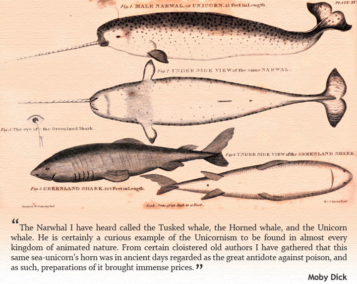 Centuries ago, royals spent their fortunes to obtain unicorn horns, which were often narwhal tusks brought back from the Arctic. InAn account of the Arctic regions with a history and description of the northern whale-fishery, published by W. Scoresby in 1820, the narwhal is labeled as “Male Narwhal or Unicorn.” Herman Melville devoted a chapter to the narwhal in his American novel Moby Dick, in which he also referred to the narwhal as the “Unicorn whale.”