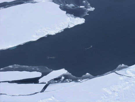 A lone narwhal is spotted in this image captured by a survey plane that Laidre and her colleagues flew over the wintering grounds. In this extreme environment, the narwhal is surrounded by ice of various densities.